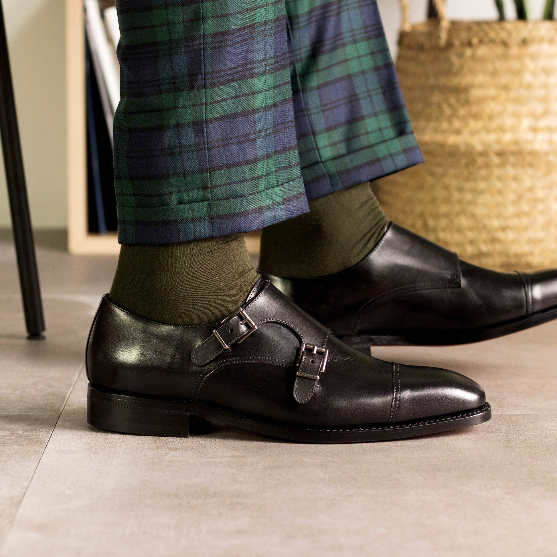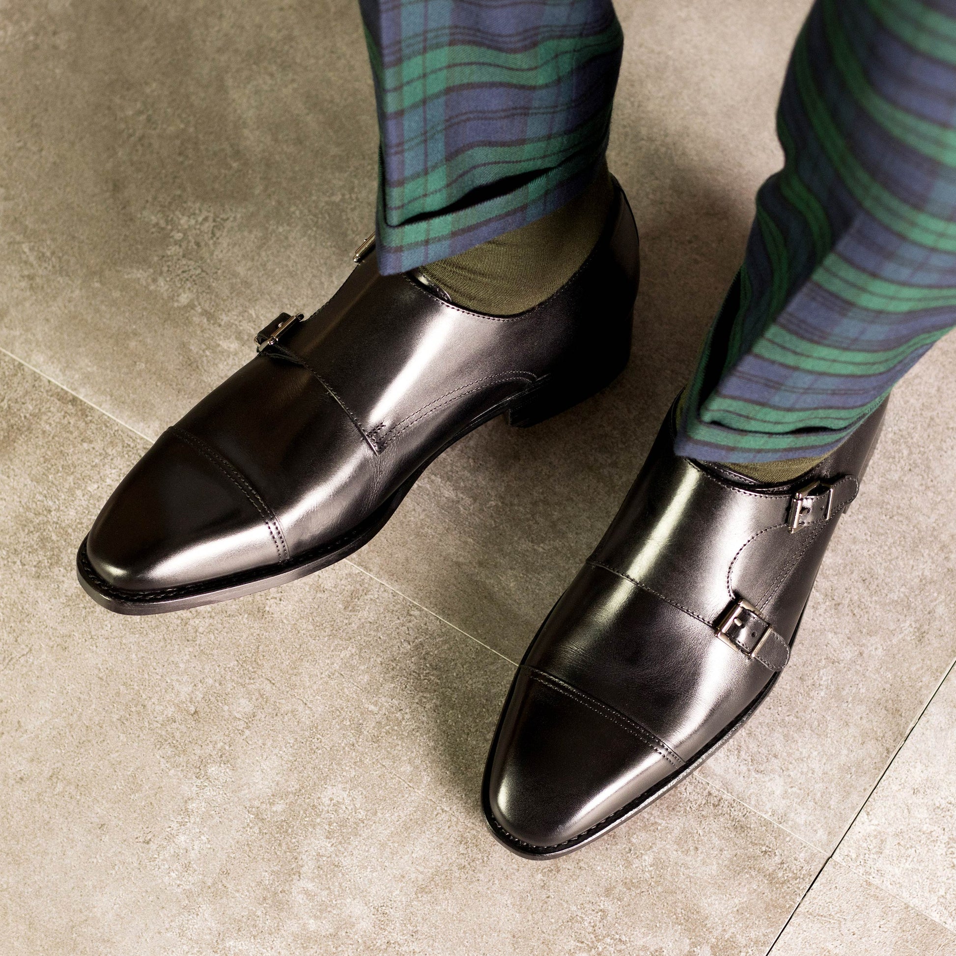 Materials: Black box calf Sole: Orange Goodyear Welt leather sole Last: Savile - Sleek looking aesthetic with slight chisel toe Featuring two straps coming across the upper, the double monk is the hottest shoe in men’s fashion right now. This shoe is perfect for anyone looking for a modern twist on a classic, elegant style.