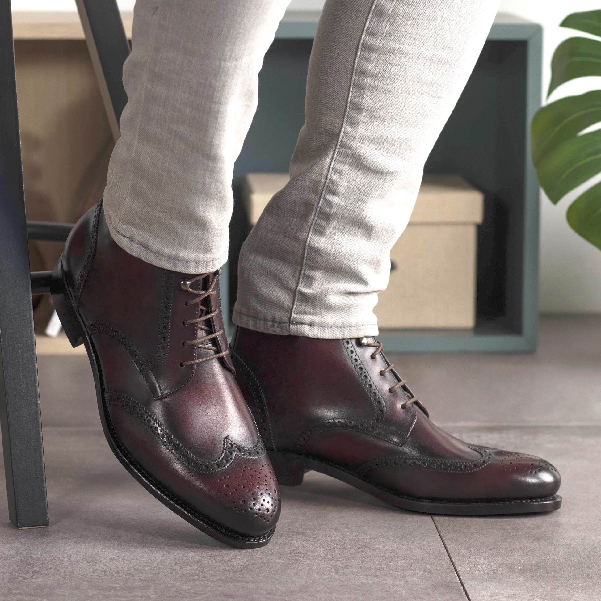 Materials:Â Burgundy box calfSole:Â lilac Goodyear welt leather soleLast:Â Zurigo - Rounded toe for traditional English Look