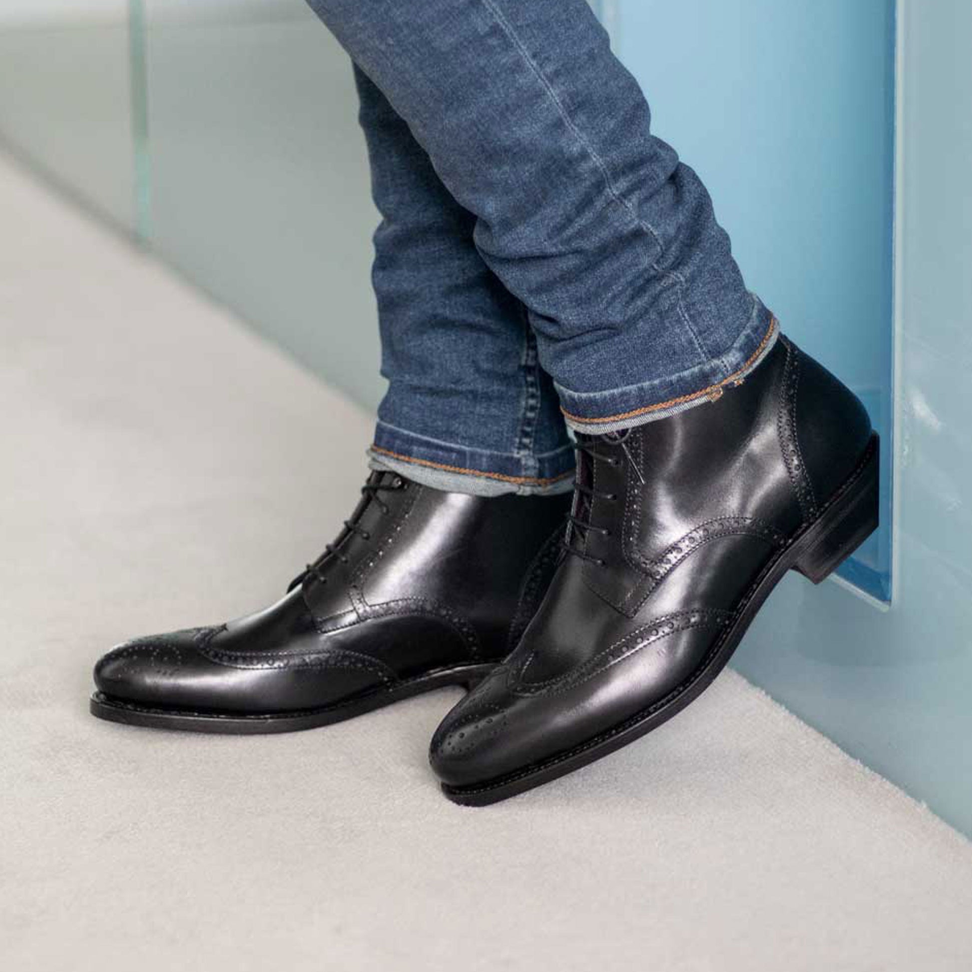 Materials:Â Black box calf Sole:Â dark red Goodyear Welt leather sole Last:Â Zurigo - Rounded toe for traditional English Look